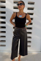 Iconic vegan leather pants in sophisticated silhouette! The wide leg culotte style feels so chic and can be styled with a sneaker or heel making it an effortless day to night styling piece. With crease detailing on the front for a more refined look and darts on the back waist that allow them to sit comfortably.