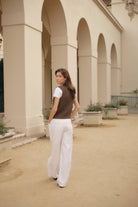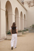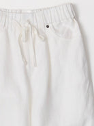 The Jeanie Pants feature a relaxed fit with an elasticized waistband and a stylish front cotton lace tie. These wide-leg linen pants are designed with metal rivet details, side and back pockets, and belt loops.