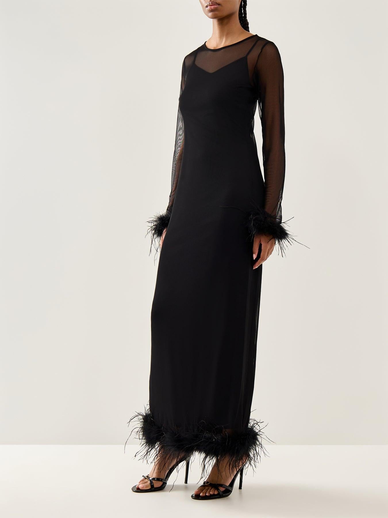 The Mesh Feather Trim Dress by Never Fully Dressed is crafted from sheer black mesh with feather cuffs. Designed to move effortlessly, it combines drama and elegance — a standout piece that balances playful texture with refined silhouette.