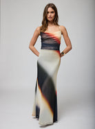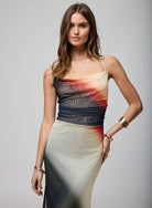 Custom print, designed exclusively for Stillwater. Inspired by the afterglow of sunset on warm coastal evenings, this gradient artwork moves from deep navy to burnt amber, diffused across slinky Power Mesh.