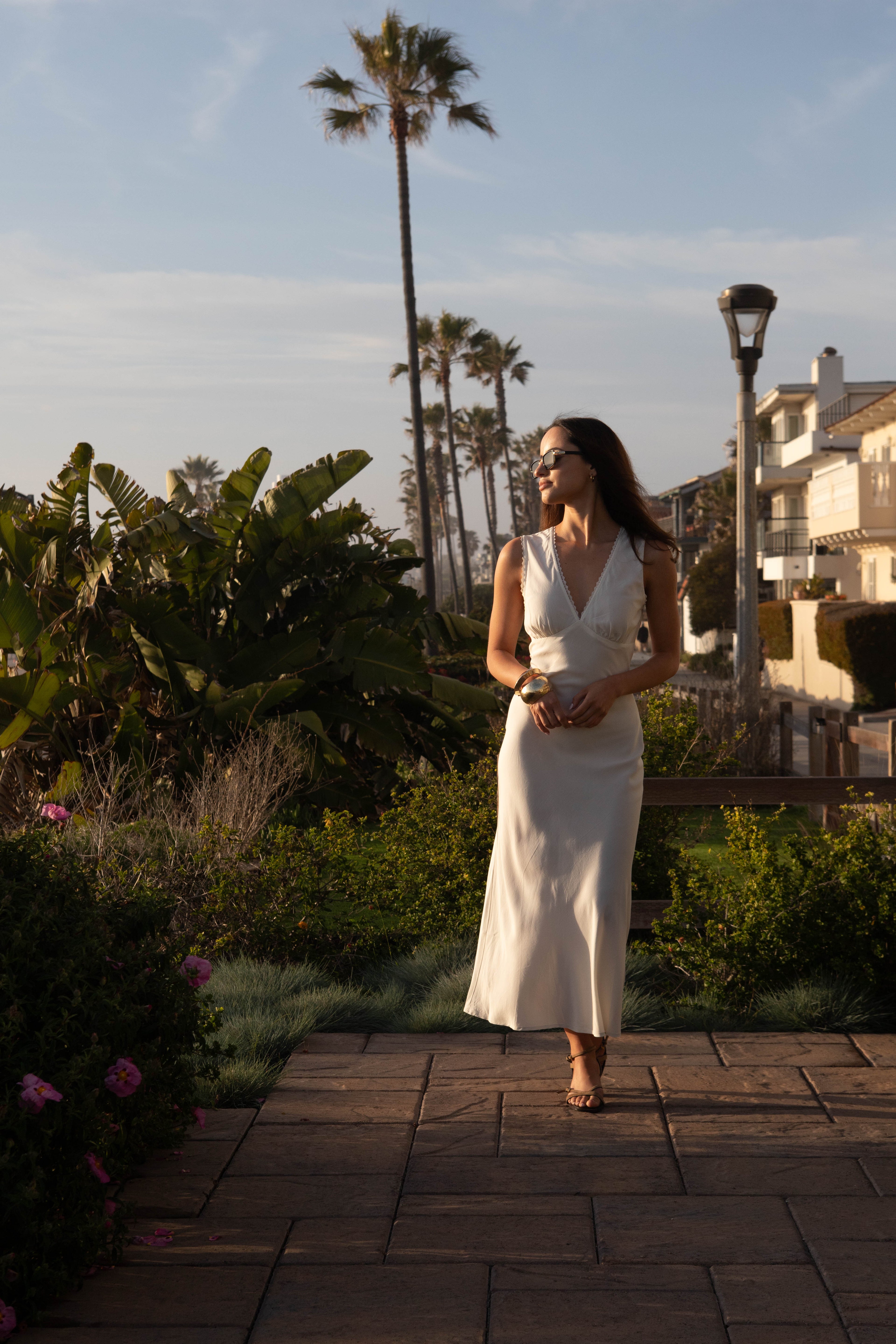 The Ellie Dress is a midi-length dress featuring a flattering contrast lace trim around the V-neckline and armholes making it easy to dress up or down for a variety of occasions!