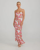 A beautiful floral print dress that is both flattering and comfortable! The low back, cross straps and bias-cut add a sexy touch!