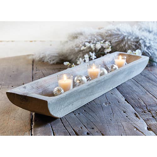 This tray is made of durable Paulownia wood and can be used for candles, food, and centerpieces. · Eco-friendly · Grey Wash Finish · Lightweight for everyday use · Hand carved by skilled artisans ·