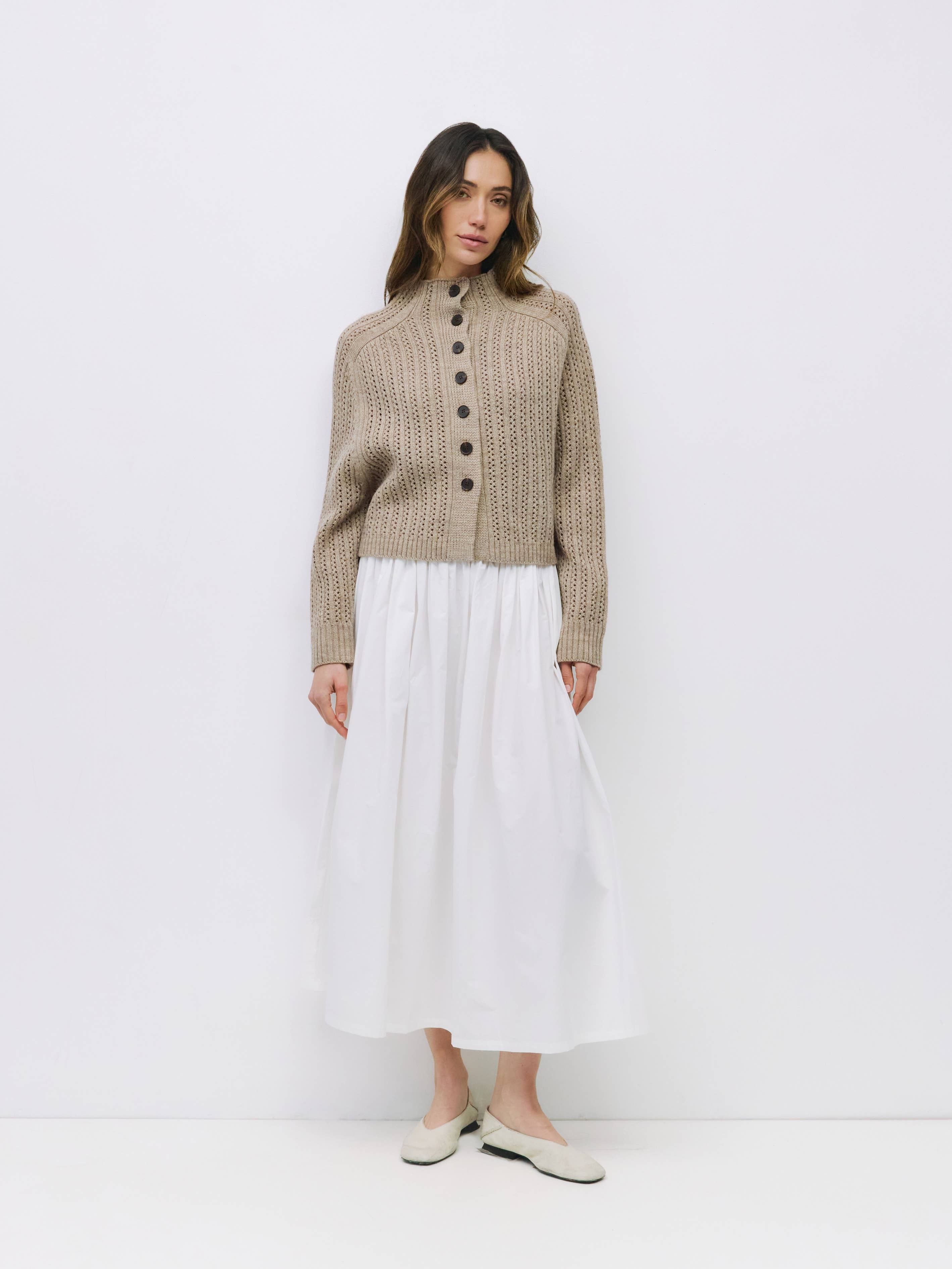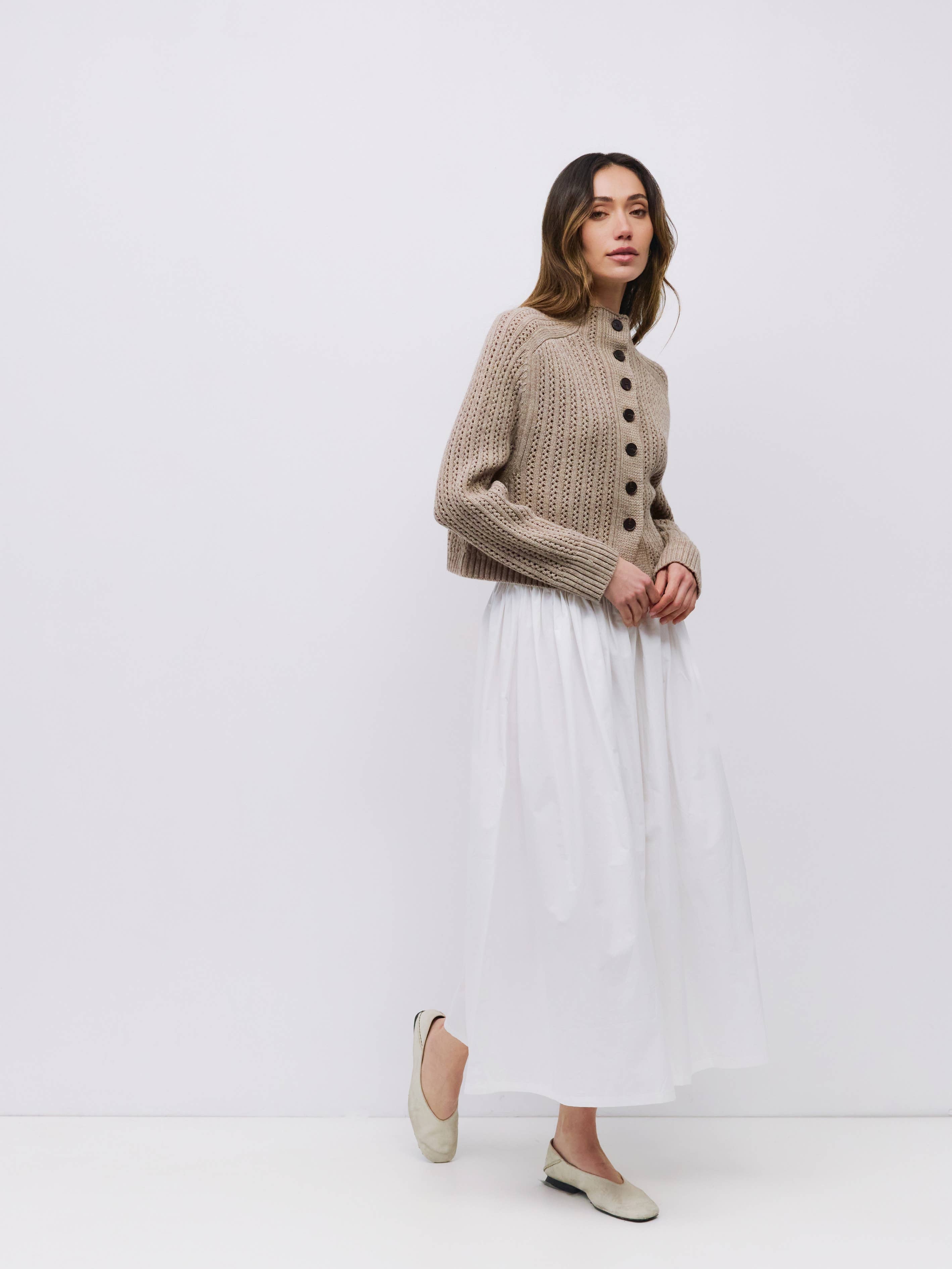The Bryan Sweater is a chunky knit turtleneck featuring a partial front button closure, raglan long sleeves and a heavy pointelle knit that combines warmth and texture in a bold silhouette.
