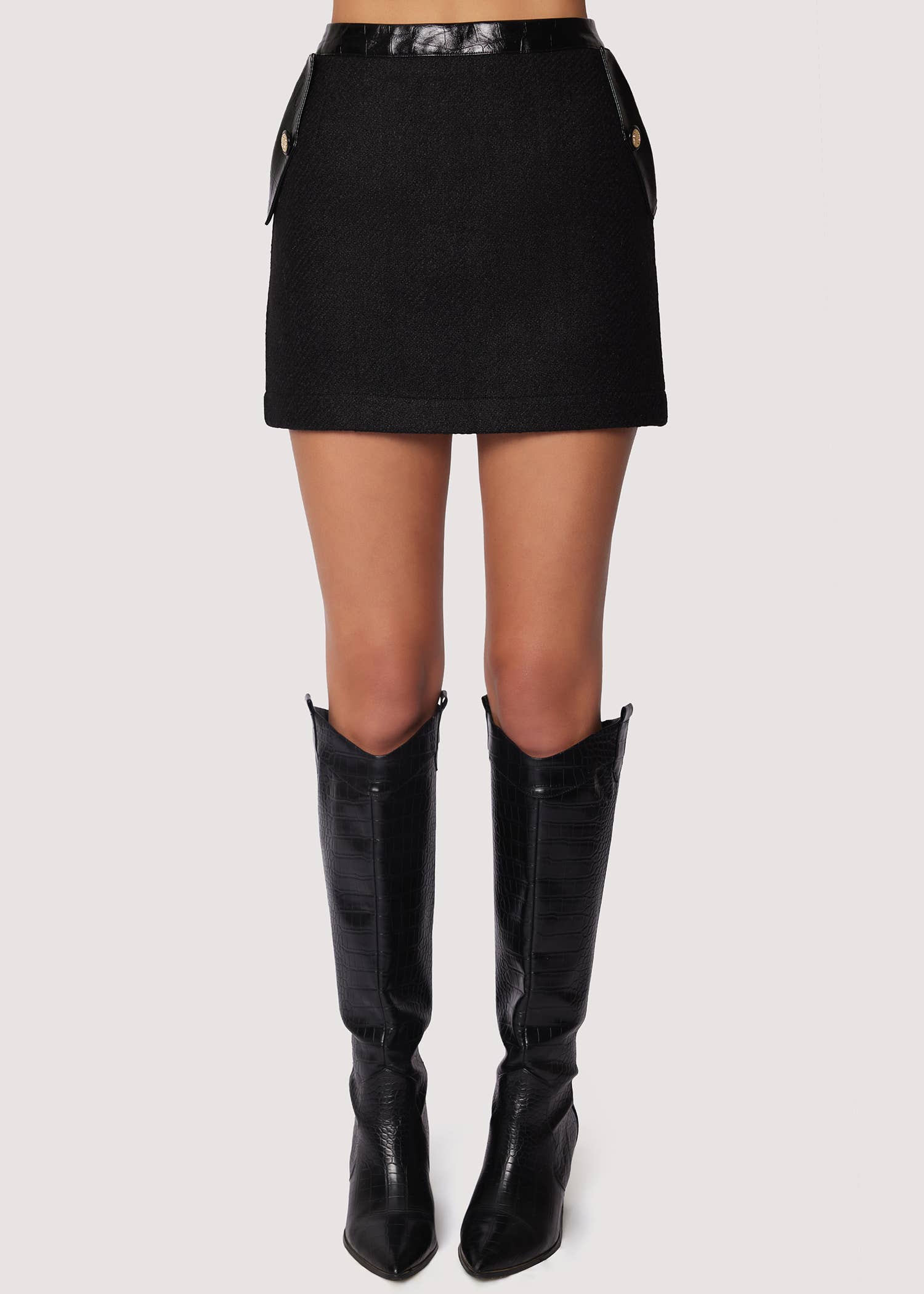 The Alessia Mini Skirt is a must-have piece for your fall wardrobe! Luxurious woven boucle fabric in timeless black, this fitted skirt is featuring chic croc pleather accents at the waistline and pockets, adding a touch of sophistication. Pair it with your favorite blouse or sweater for a stylish and versatile look that transitions seamlessly from day to evening. Make it a set with our Alessia Jacket top!