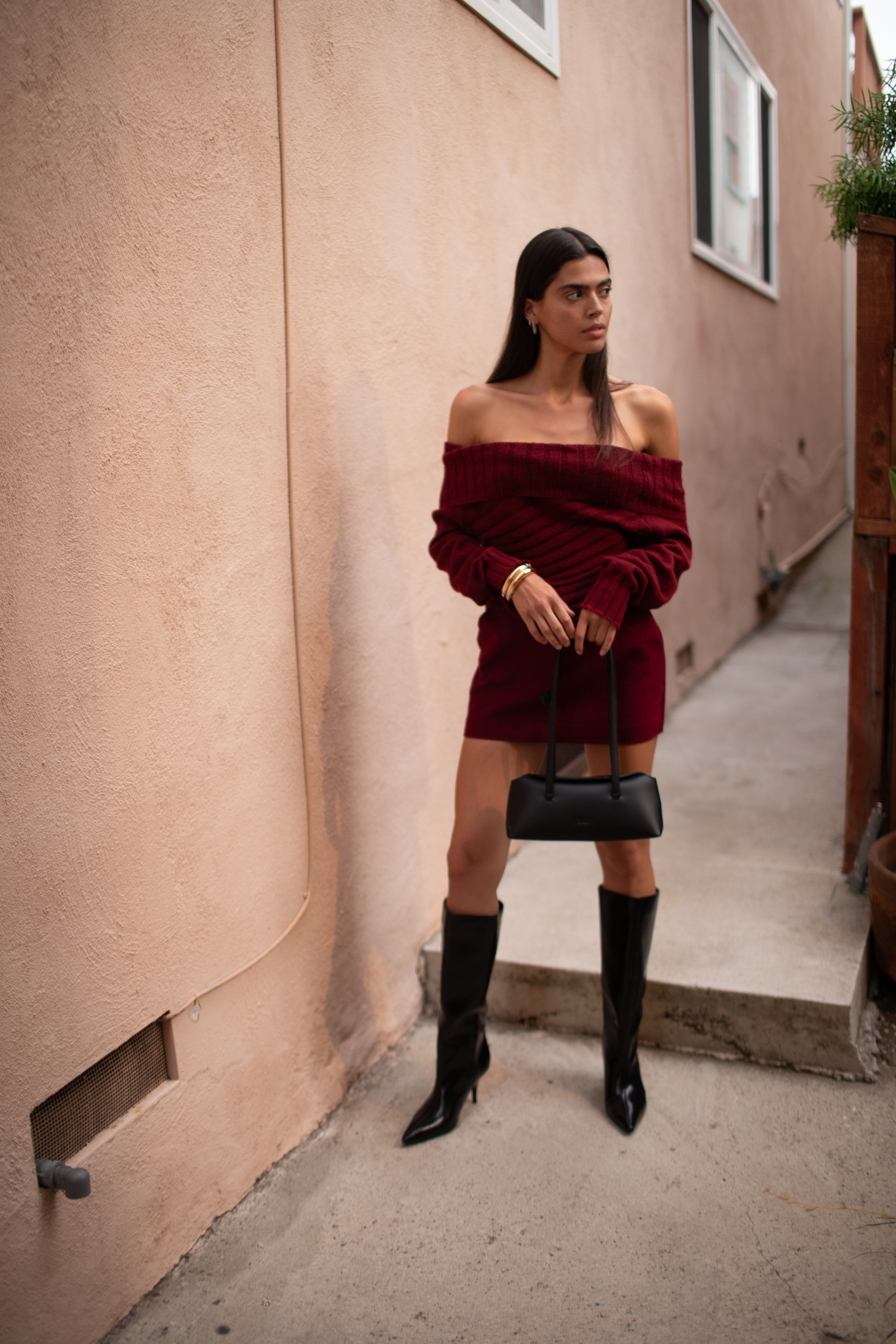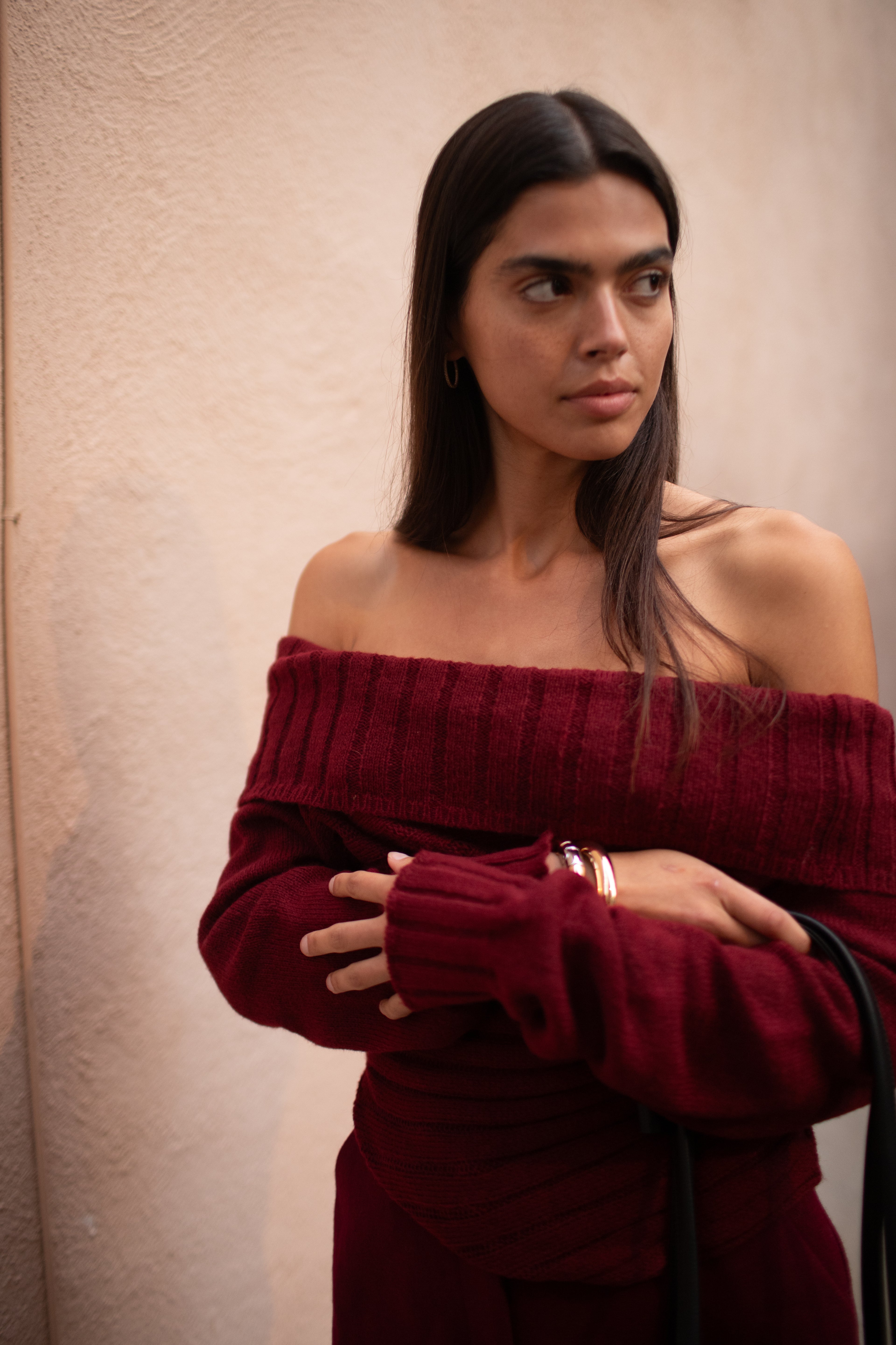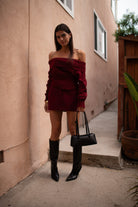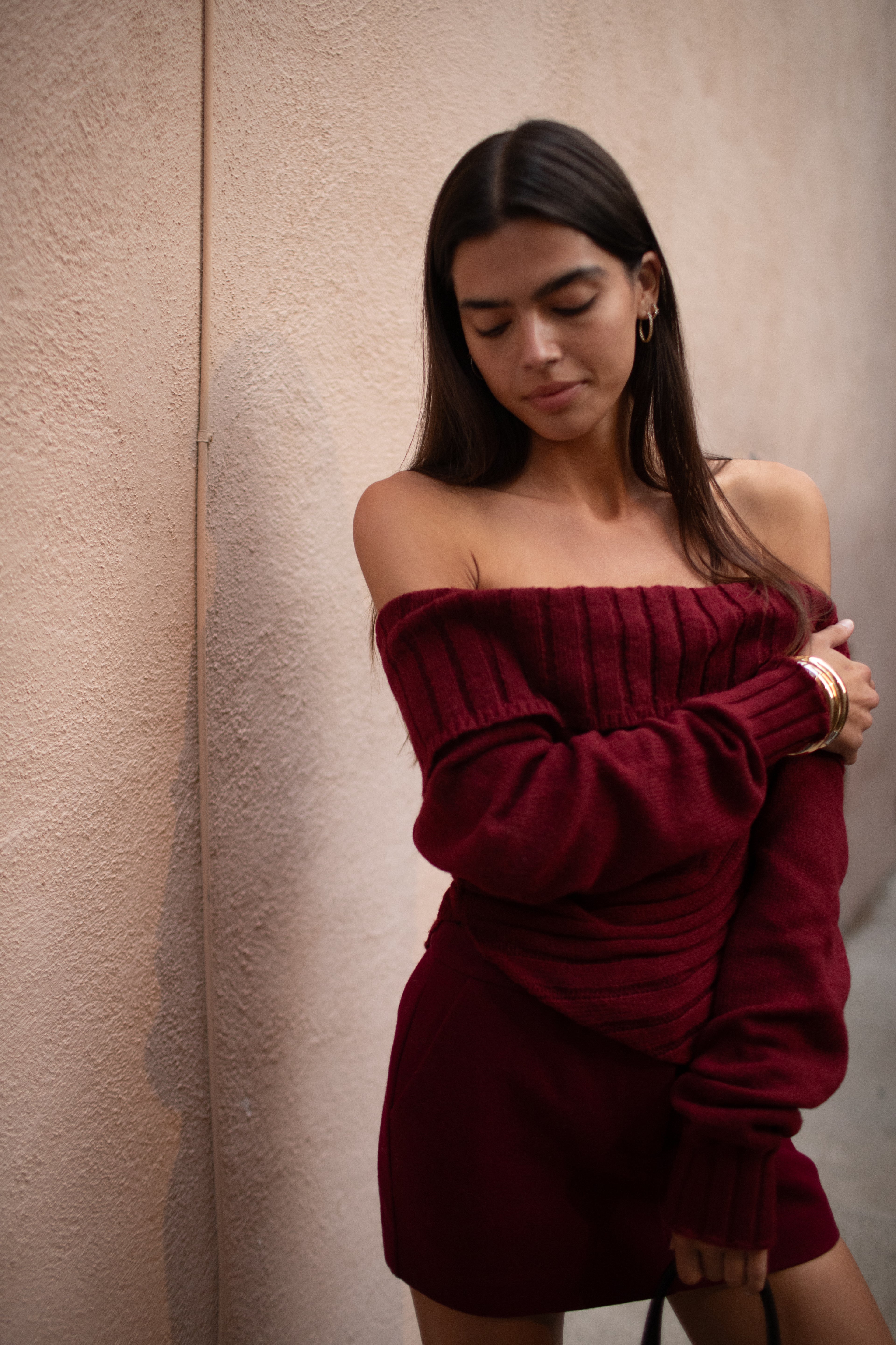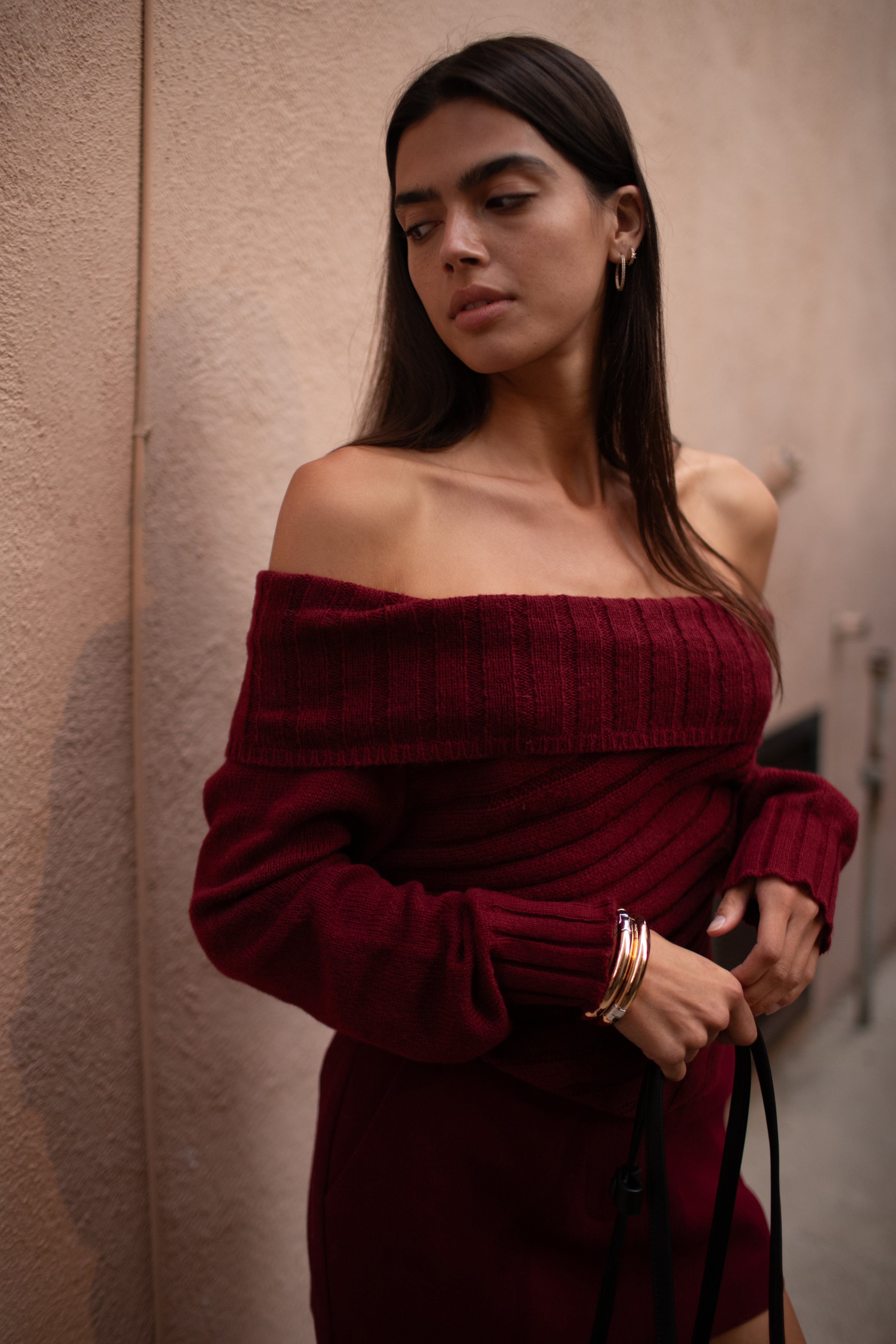 The Betty Sweater comes in a beautiful burgundy knit. Pair it with our Noelia Mini Skirt for the perfect tonal look!