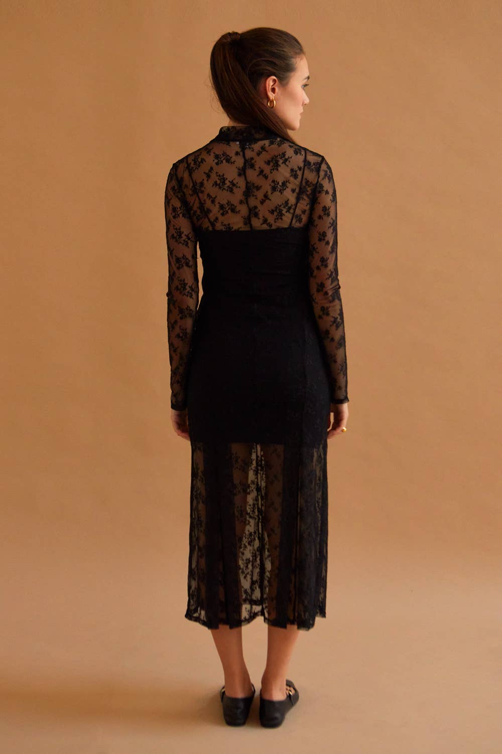 The Scarlett Mock Neck Lace Midi Dress features a sheer floral patterned lace outer dress designed in a fit-and-flare silhouette with mock neck, long sleeves, and front pleat details. Comes with a stretchy knit fitted inner dress.
