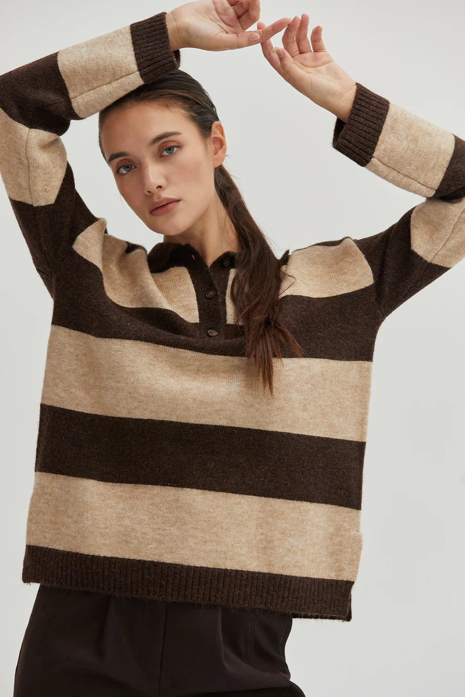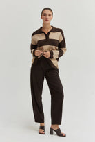The Ellie Stripe Polo Sweater features a collared neckline with buttoned placket, long sleeves with drop shoulders, and big stripe pattern throughout. Cut in a relaxed fit.