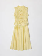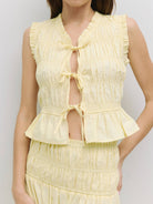 The Natalie Top is a charming sleeveless top with a V-neckline and front tie detailing. Featuring paneled shirring and ruffle accents around the neckline and sleeves, this top adds a playful touch to any outfit. Pair it with your favorite denim or style it with The Natalie Skirt to make it a set!