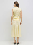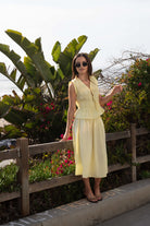 The Natalie Skirt is a comfortable midi-length skirt featuring a triple elasticized waistband and stylish paneled shirring detail at the waistline. Pair it with the matching Natalie Top to make it a set!