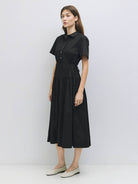 The Sabrina Dress is a midi dress with a classic collar neckline and short sleeves, featuring a top front button-down closure. Its adjustable tunnel waistline with side ties and paneled shirring on the skirt make it a versatile choice for any occasion.