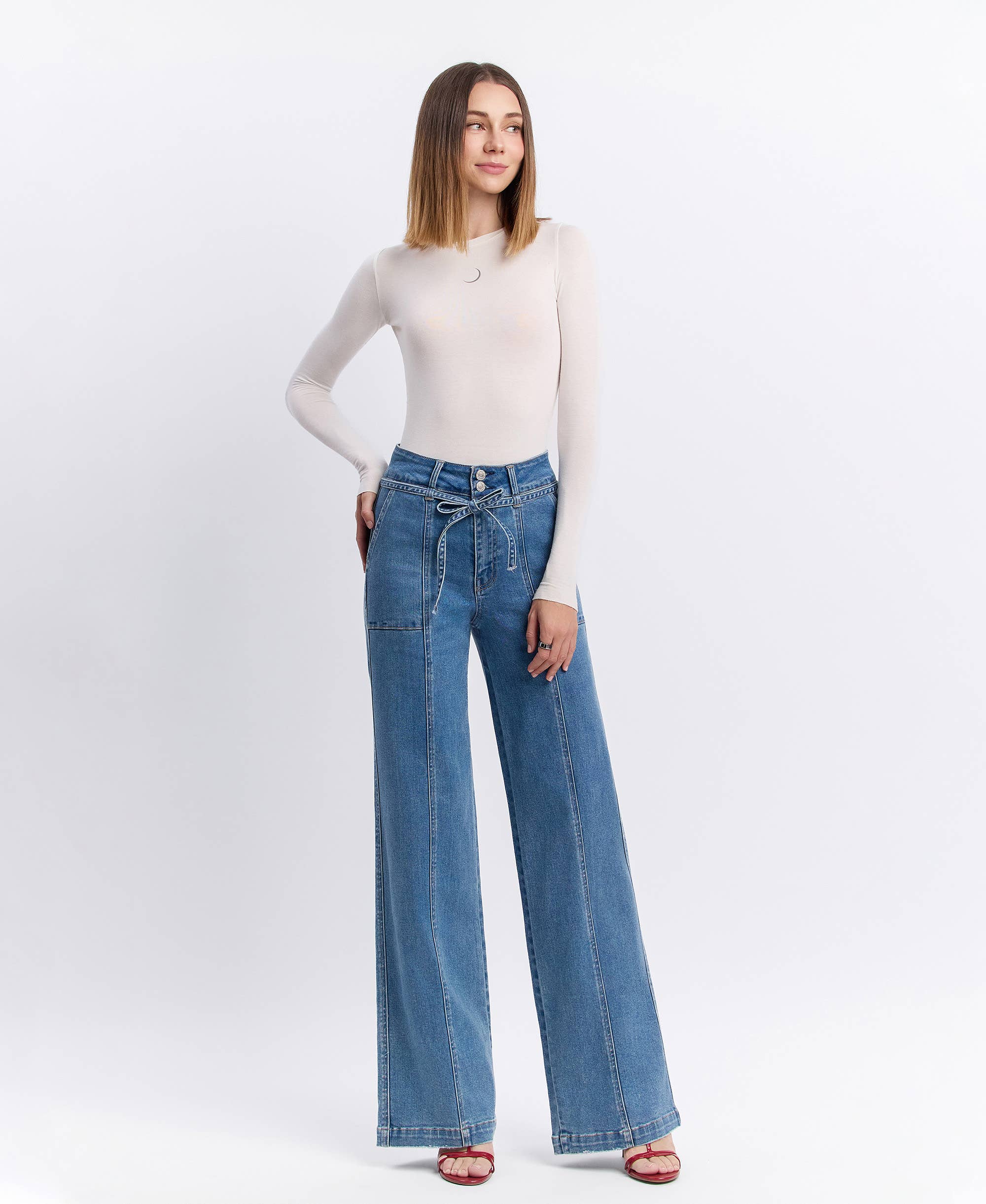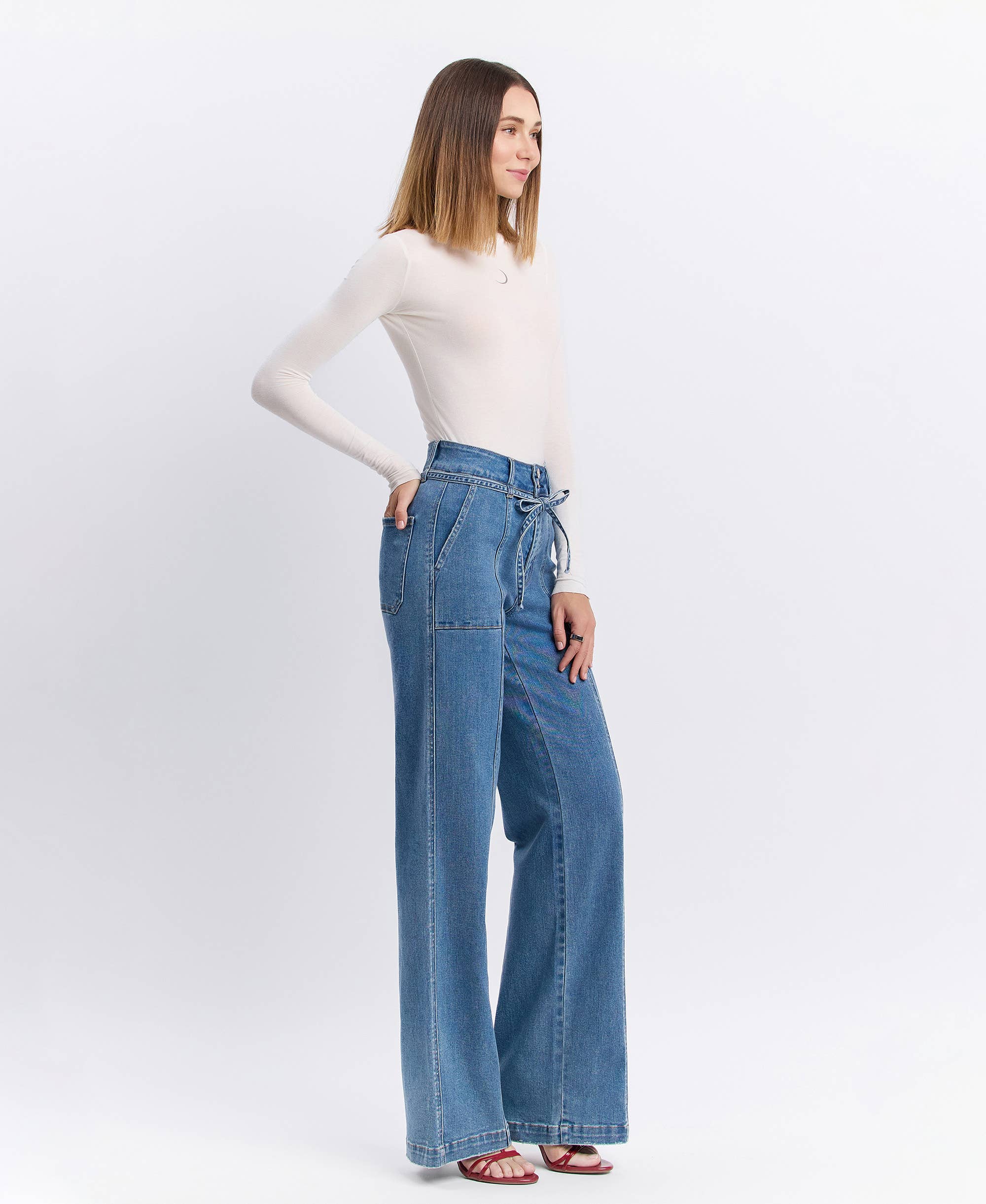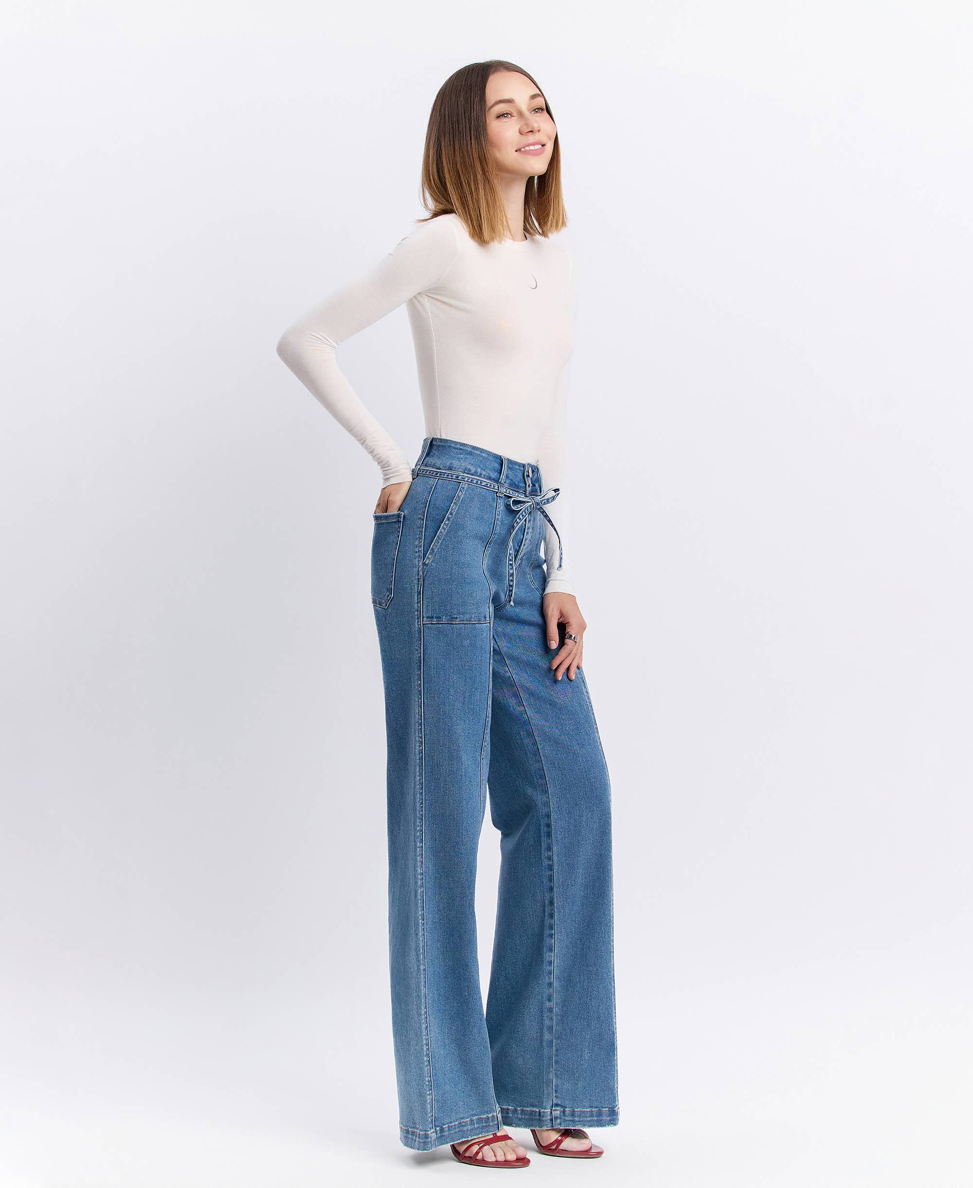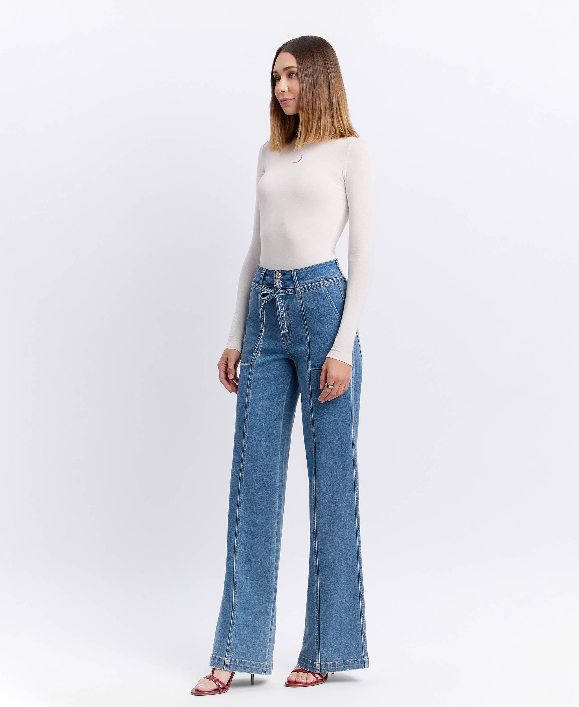 High Rise Tie Waistband Wide Leg Jean