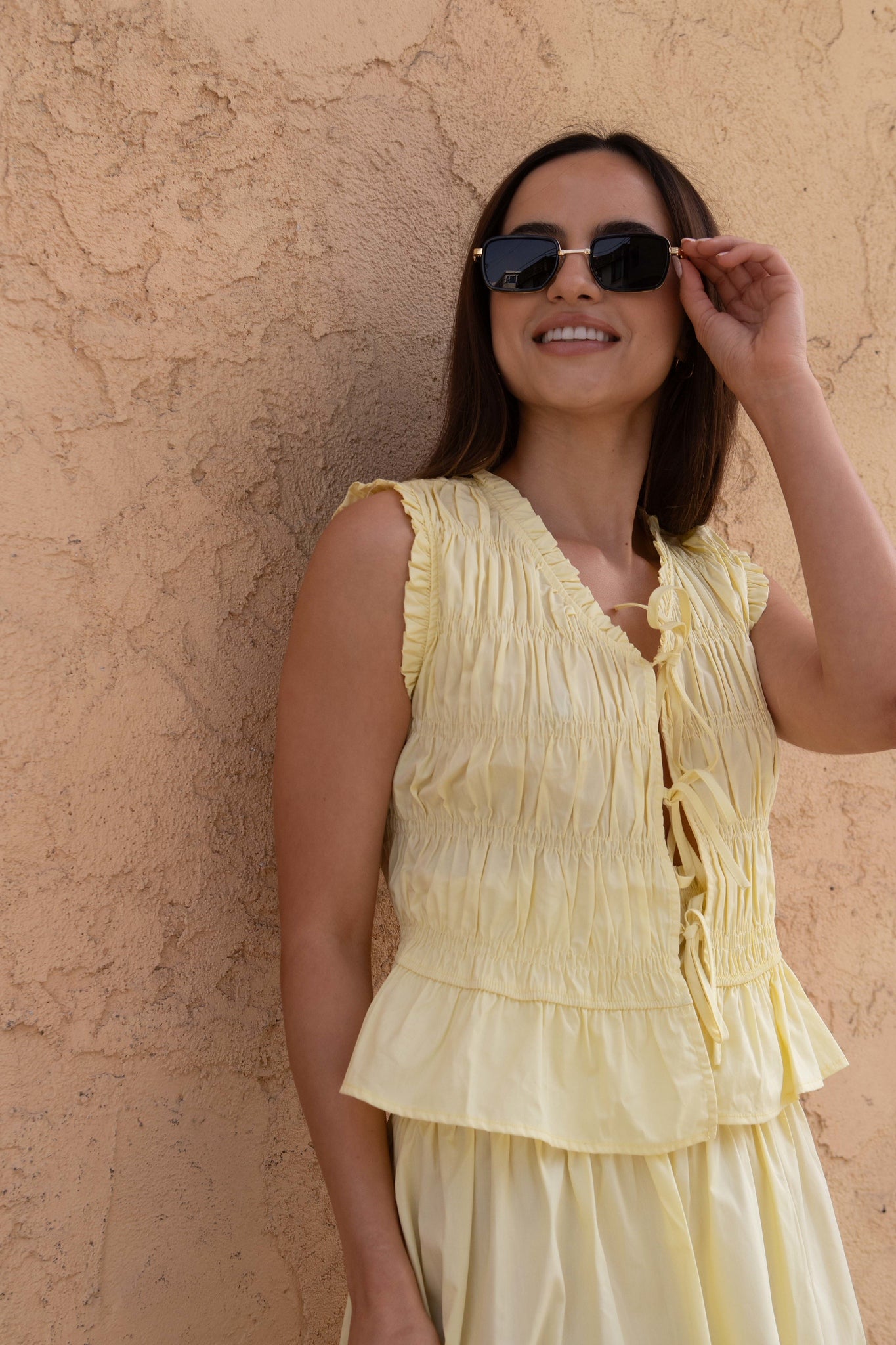 The Natalie Top is a charming sleeveless top with a V-neckline and front tie detailing. Featuring paneled shirring and ruffle accents around the neckline and sleeves, this top adds a playful touch to any outfit. Pair it with your favorite denim or style it with The Natalie Skirt to make it a set!