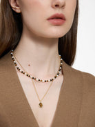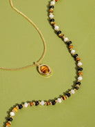 Embrace the trend of stack necklaces with our Contemporary Stacked Beads and Gemstone Necklace—a standout choice for those who appreciate versatility and style. Featuring brown and black beads, this necklace effortlessly complements any neutral outfit, while the captivating cat eye stone adds a touch of statement allure. Designed for all seasons, this necklace is a must-have addition to your jewelry collection,