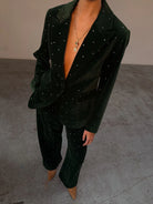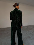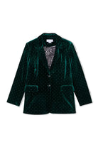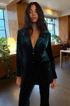 A single breasted blazer made from a buttery soft emerald velvet and studded with little diamonds. The silhouette is designed for a relaxed fit with large side pockets. Style yours with leather trousers and loafers for the office or the matching arden trousers and heels for after work drinks.
