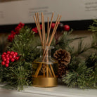 Featuring a classic glass vessel with golden logo and painted base, the holiday reed diffuser is festively packaged in a gold and white decorative box with a geometric pattern and metal edging. Notable are the fiber reeds that release twice the fragrance—no flipping needed.