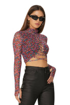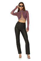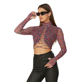 - Snug-fitting silhouette accented by an open neckline and a fixed lace-up front detail