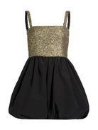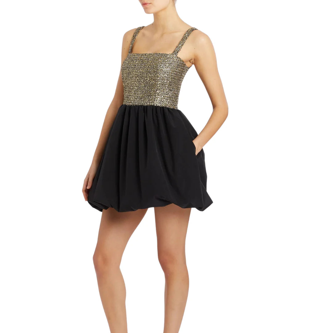 Go all out in the Christine Dress, your answer to holiday dressing. Featuring a shimmering, princess seam bodice and bold black bubble skirt, this dress is the perfect combination of elegance and celebration. Add more gold with jewelry and accessories, and top with a fur coat for a luxurious look. Perfect for holiday parties, winter soirées or gala dinners.