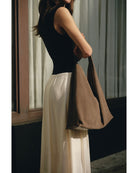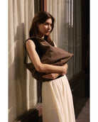 The Capri Dress combines a high gauge knit top with a fully lined, pleated skirt for a striking contrast. The bottom skirt is crafted from mid-weight, slinky woven fabric, and the dress features a mock neck and a side zipper closure for ease of wear.