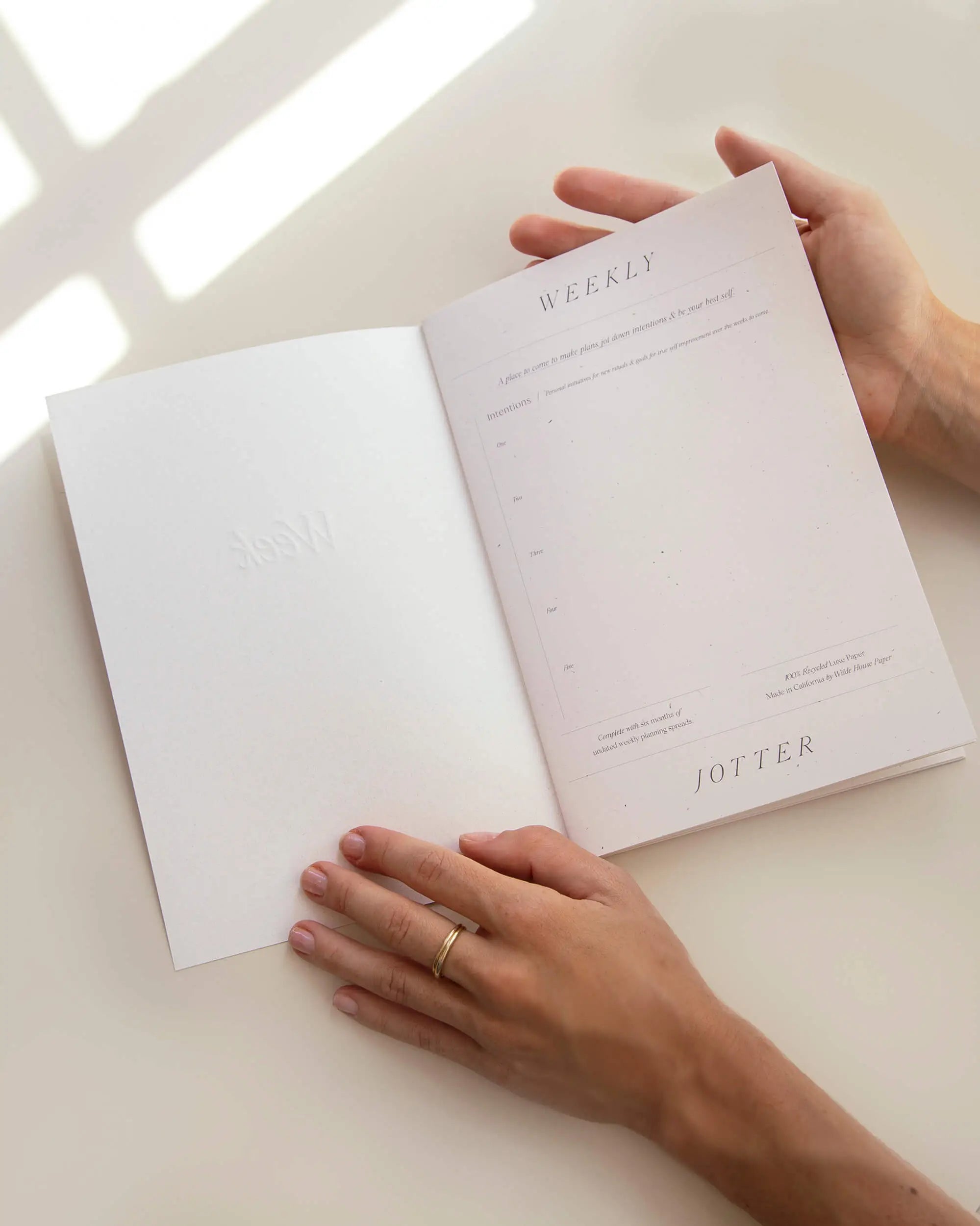 A minimal week planner designed to guide you in mindfully organizing your week. By setting intentions at first use to come home to and crafting your ideal version of an organized week, the Week Jotter becomes a weekly companion that connects you with your best self. 6’’ x 9’’ 27 undated weekly planning spreads with an opening page to set intentions for the year ahead. Letterpress cover and inner pages printed on luxe recycled stock made from 30% post-consumer waste. Saddle stitch binding.